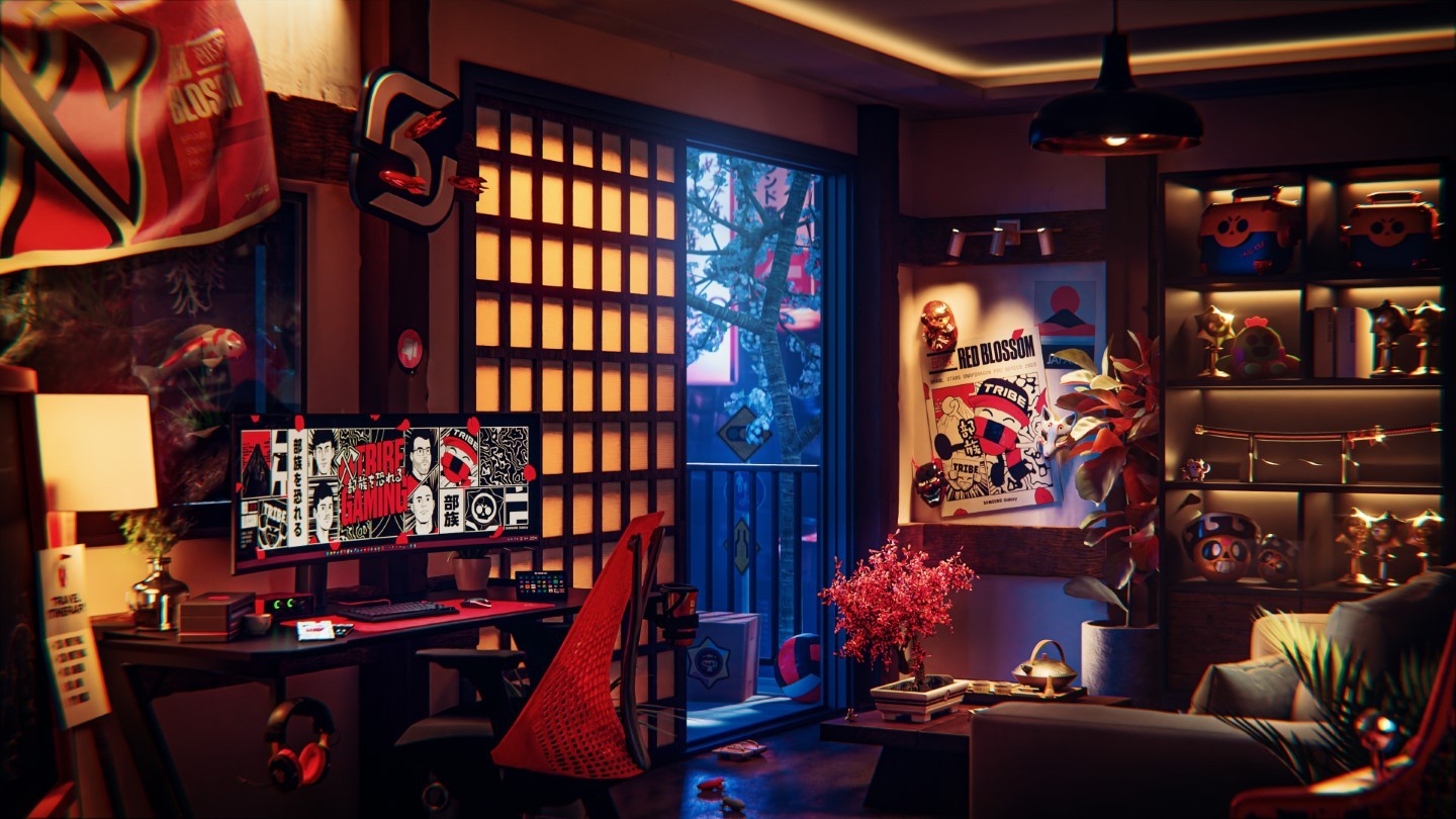 The room was filled with a diverse array of 3D models, all crafted in-house. There were over 25 elements in total, ranging from futuristic tech objects for sponsors, custom display cases for the baseball cards, elements inspired by the Brawl Stars game, and traditional Japanese fixtures. Each of these pieces added to the visual harmony of the Tribe Room.